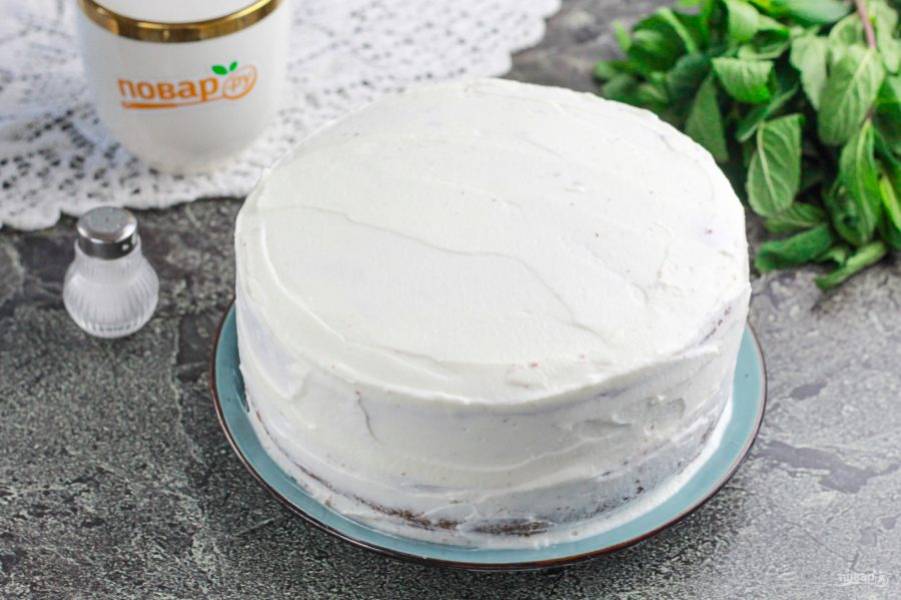 Накройте еще одним коржом и промажьте кремом. Обмажьте верх и бока торта кремом, отправьте его минимум на полчаса в холодильник.