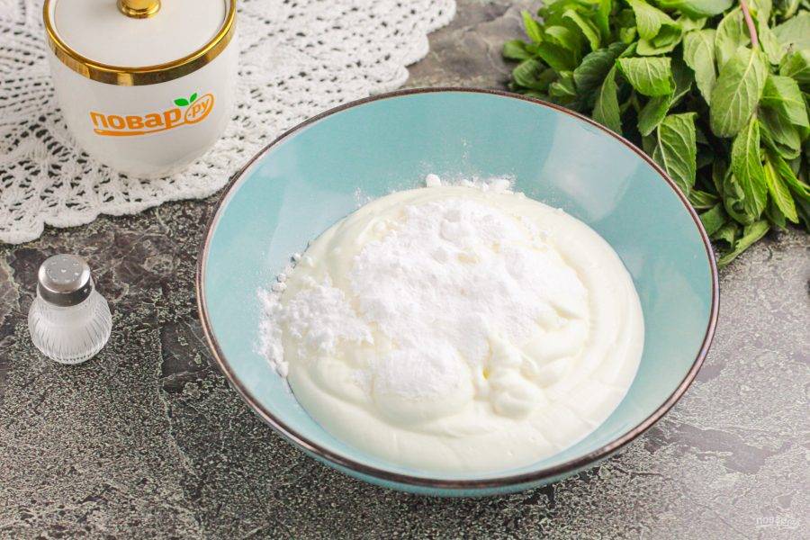 Сметану любой жирности выложите в миску или салатник и всыпьте в нее сахар, загуститель для сметаны.