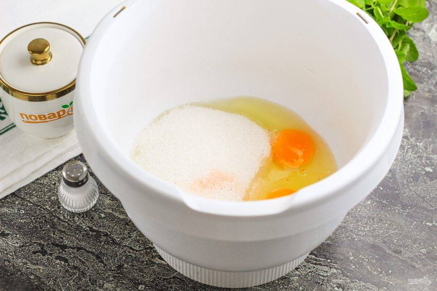 Яйца вбейте в чашу миксера или кухонного комбайна, всыпьте сахар и соль, взбейте в течение 4-5 минут в пышную пену.