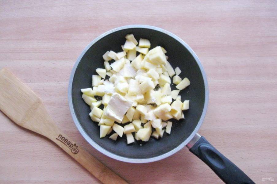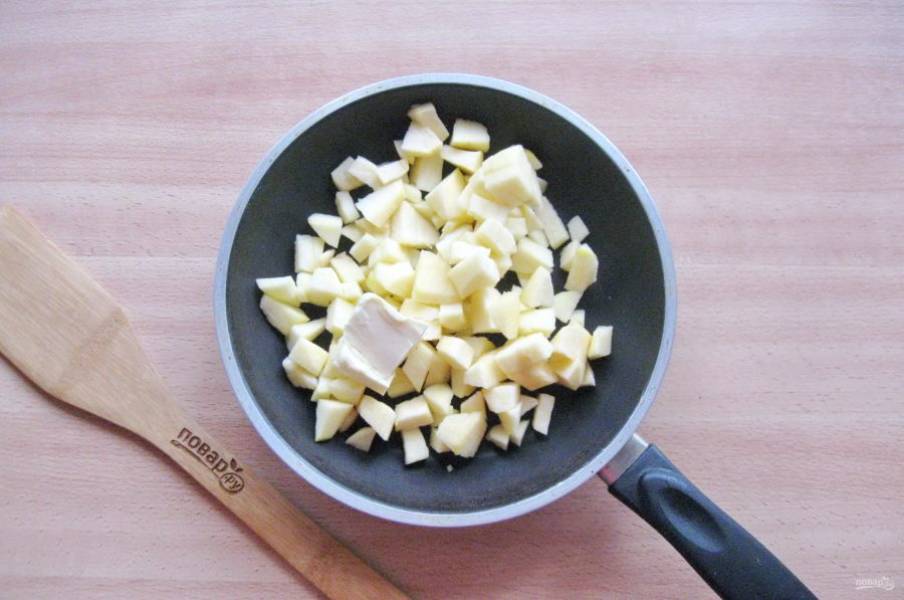 Сделайте начинку из яблок. Фрукты помойте, очистите, удалите семечки и нарежьте мелкими кубиками. Выложите в сковороду.