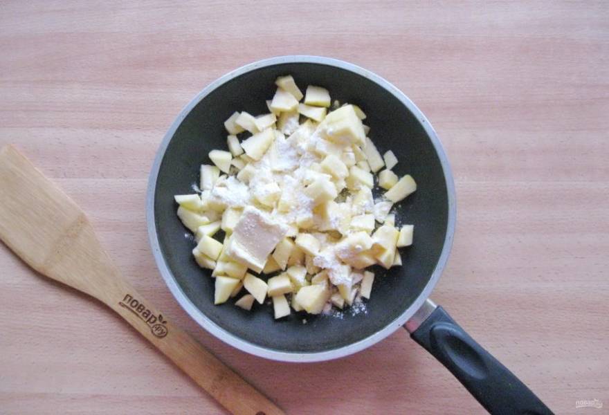 Перемешайте яблоки с сахаром и мукой. Тушите на среднем огне 7-8 минут.