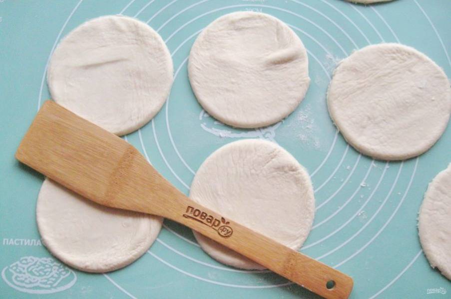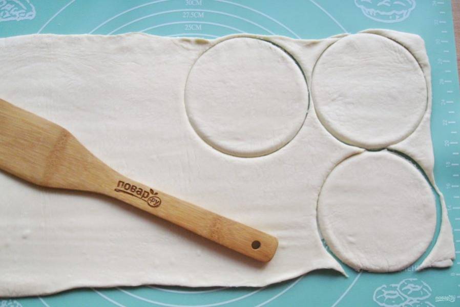 Слоеное тесто немного раскатайте и вырежьте круги диаметром 15 сантиметров.