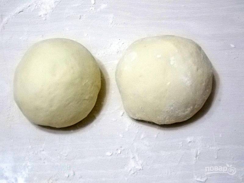 Разделите тесто на 2 части и скатайте шарики. Накройте и уберите в тепло на 15 минут.