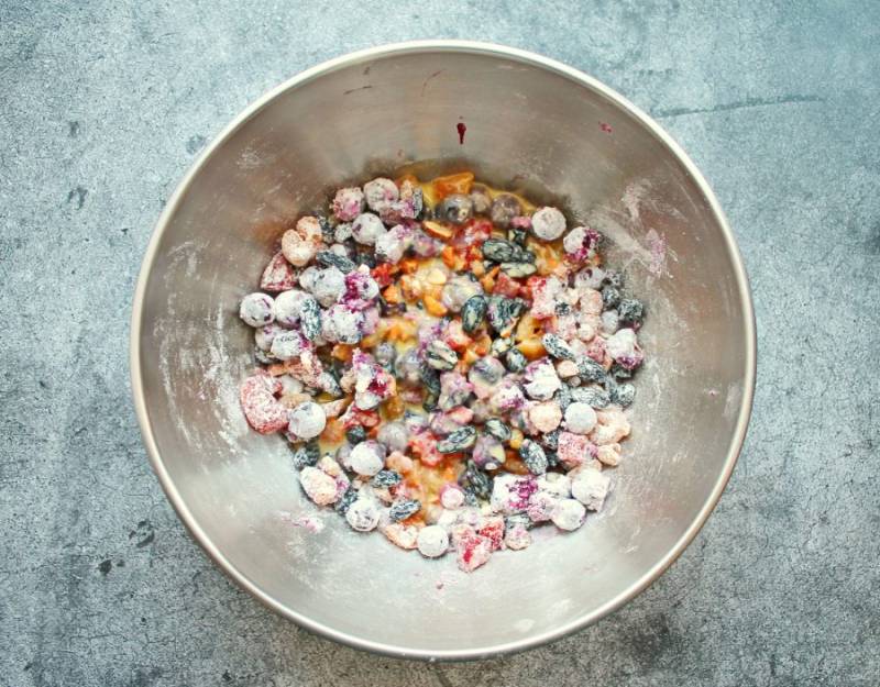 Черную смородину разморозьте на сите и дайте стечь соку. Переложите ягоды в миску и добавьте муку, специи и потрясите, чтобы они полностью покрылись.