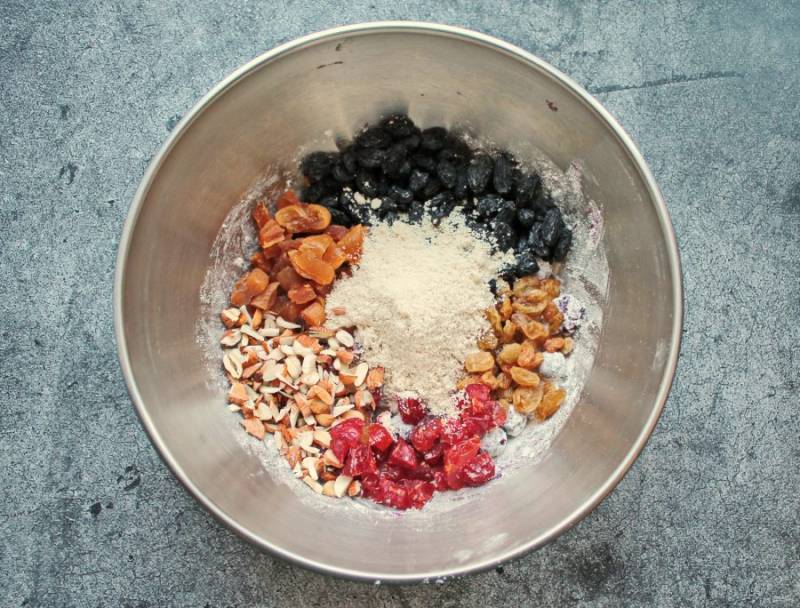 Подготовьте все необходимые ингредиенты для приготовления шотландского новогоднего кекса. Сухофрукты вымойте и обсушите.