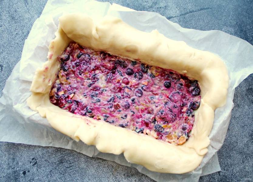 Тесто раскатайте между двух пергаментов в тонкий пласт. Выложите тесто в форму 12 на 26 сантиметров застеленную пергаментом. Выложите внутрь теста начинку.