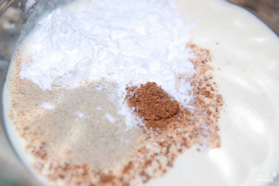 В чашке смешайте жирные сливки, муку, мускатный орех и белый перец. Посолите по вкусу.