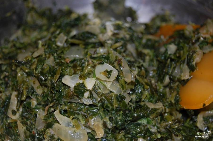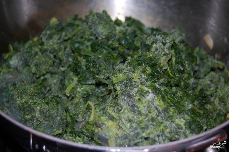 Мешайте шпинат с луком и чесноком в растительном масле, пока шпинат не уменьшиться в три-четыре раза.