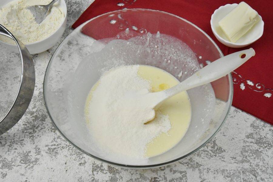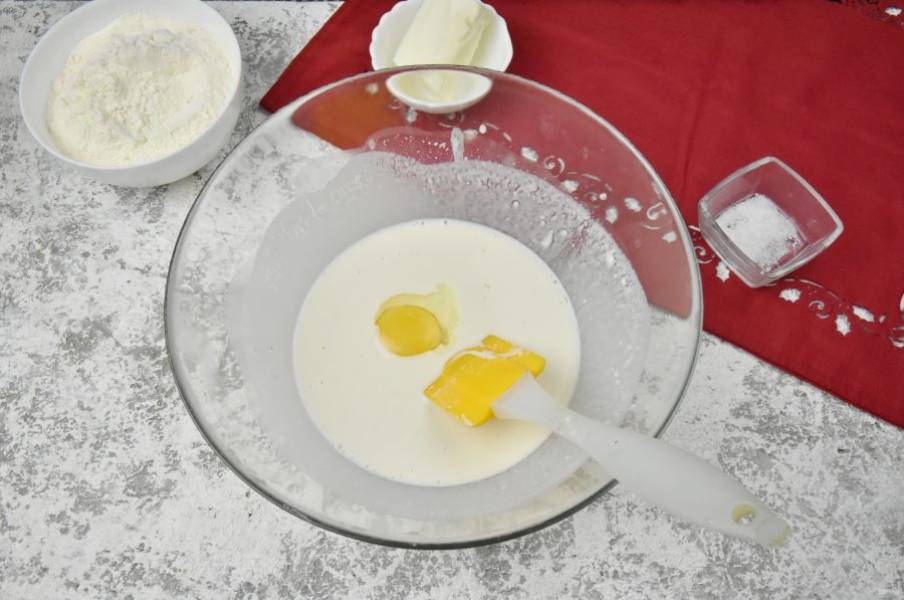 В жидкую составляющую теста добавьте мед и яичный желток. Размешайте.