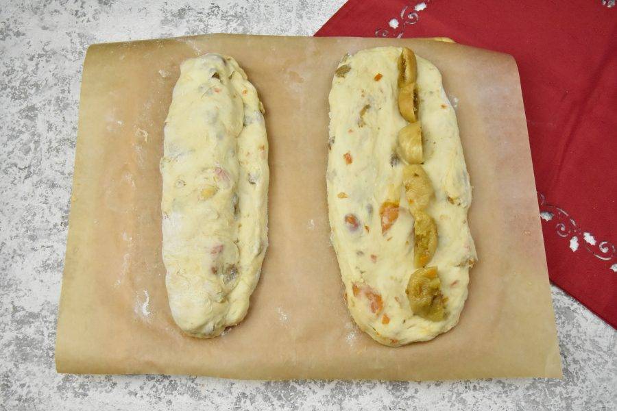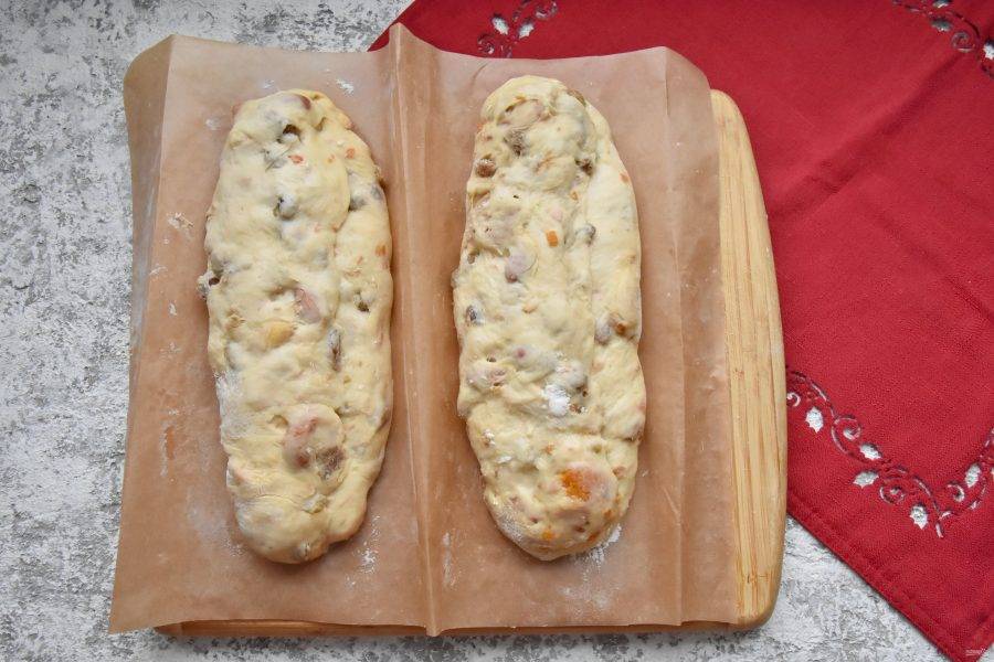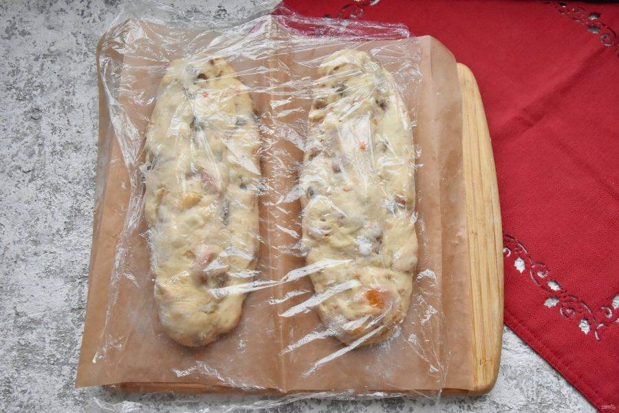 Переместите изделия на противень вместе с пергаментной бумагой. Штоллены накройте пищевой пленкой и оставьте на расстойку еще на 1-1,5 часа.