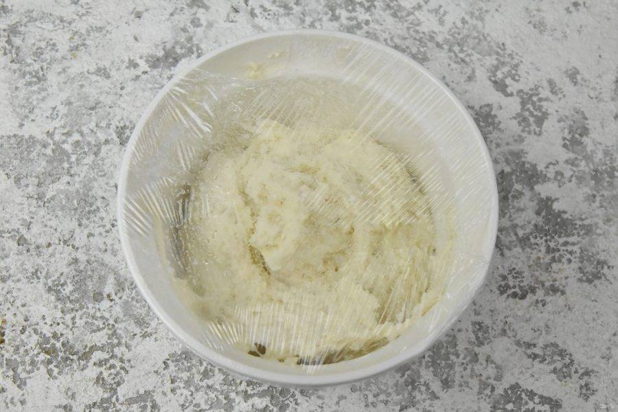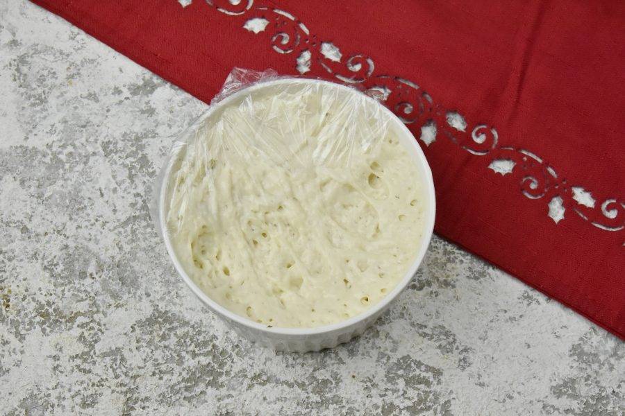 Накройте емкость с опарой пищевой пленкой и поставьте в холодильник на нижнюю полку на 10-12 часов. Когда закваска достигнет максимальной активности, можно приступить к приготовлению теста для штоллена.