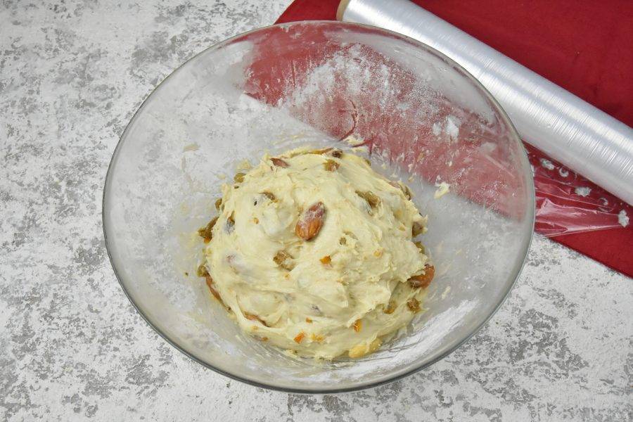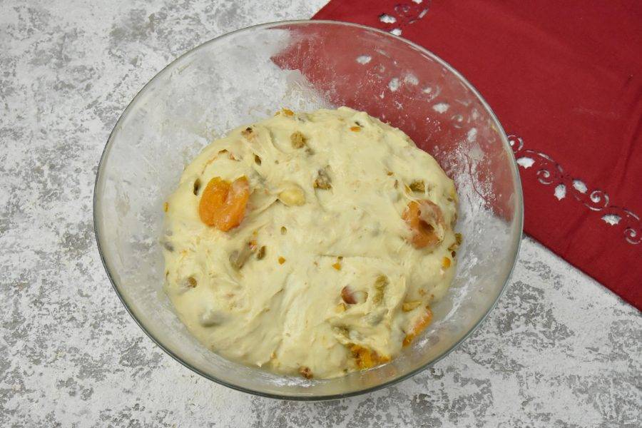 Сухофрукты откиньте на сито или разложите на бумажном полотенце, чтобы удалить лишнюю влагу. Переложите в тесто и вмешайте их в тесто методом складывания.