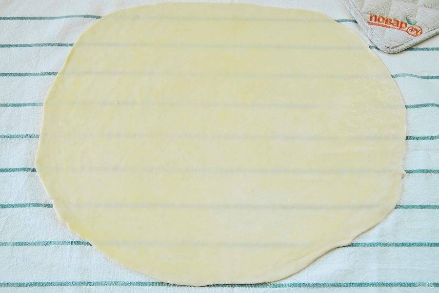 Чистое кухонное полотенце слегка припылите мукой и раскатайте на нем тесто в виде большого прямоугольника до прозрачного состояния.