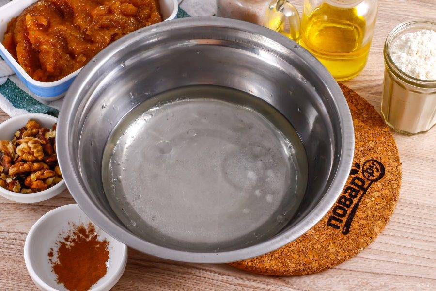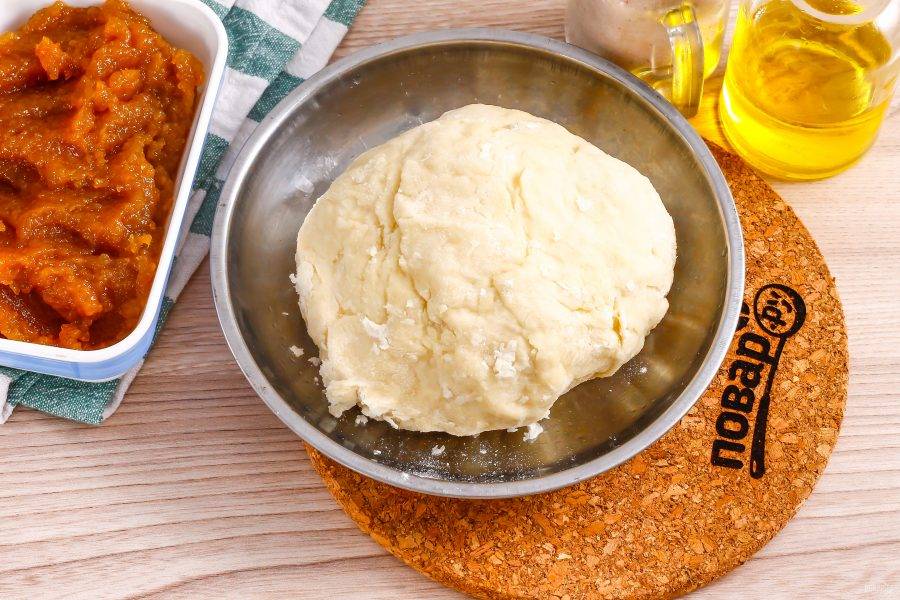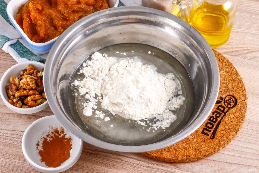 Всыпьте пшеничную муку, предварительно ее просеяв. Замесите тесто.