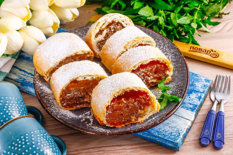 Аппетитный штрудель с вареньем идеально подойдет для завтрака, полдника или для десерта. Такое теплое лакомство сочетают с шариком мороженого и горячим или кофе.