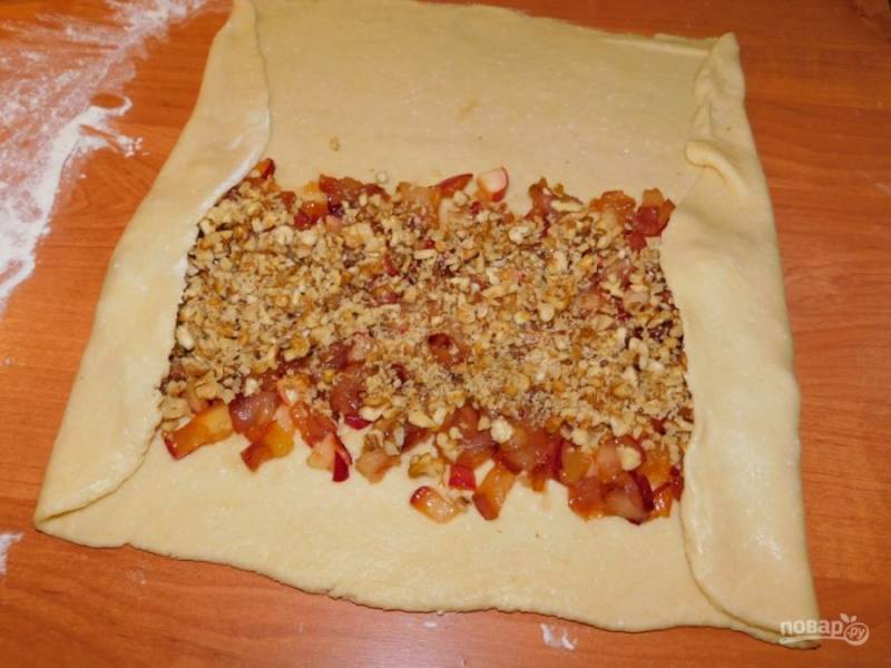 Тесто раскатайте, выложите яблочную начинку и посыпьте измельченными грецкими орехами. Заверните края и сверните рулетом. Верх смажьте желтком и поставьте штрудель в духовку, разогретую до 180 градусов на 30-40 минут.