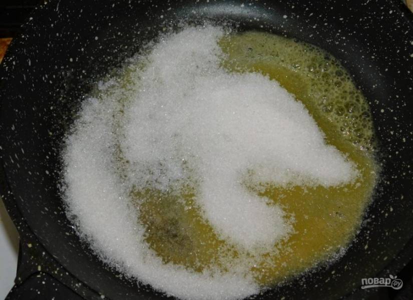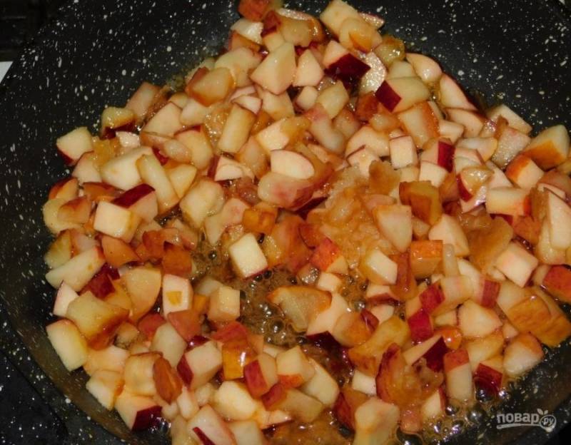 Пока тесто отдыхает, приготовьте начинку. Для этого растопите на сковороде сливочное масло, добавьте яблоки, нарезанные кубиками.