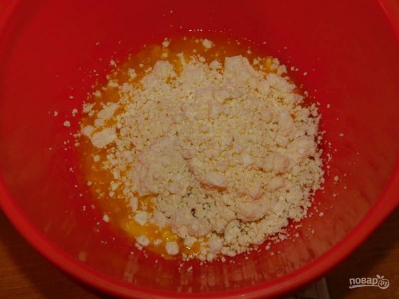 Для приготовления теста смешайте мягкое сливочное масло, яйцо, творог, сахар и соду.