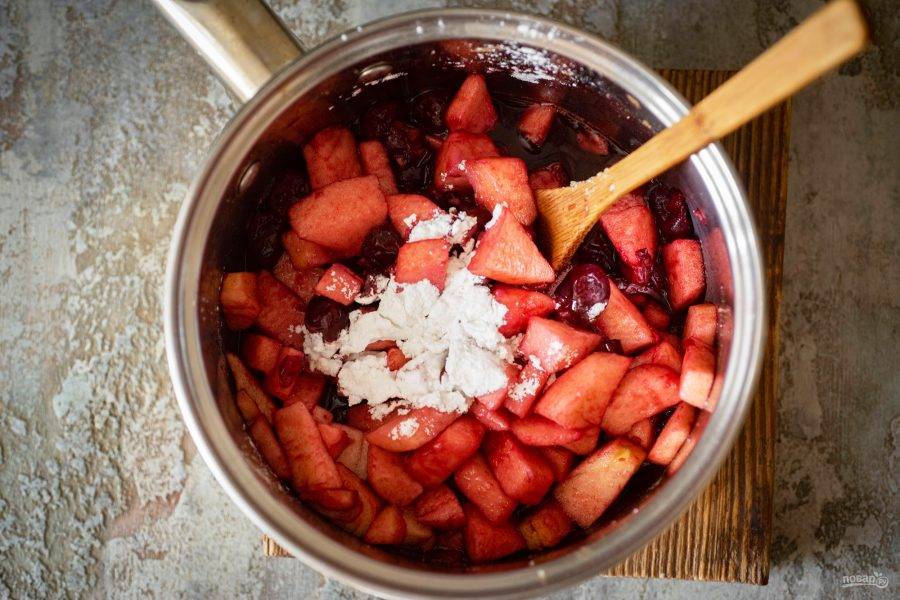 Добавьте крахмал и еще проварите до загустевания, постоянно помешивая ложкой.