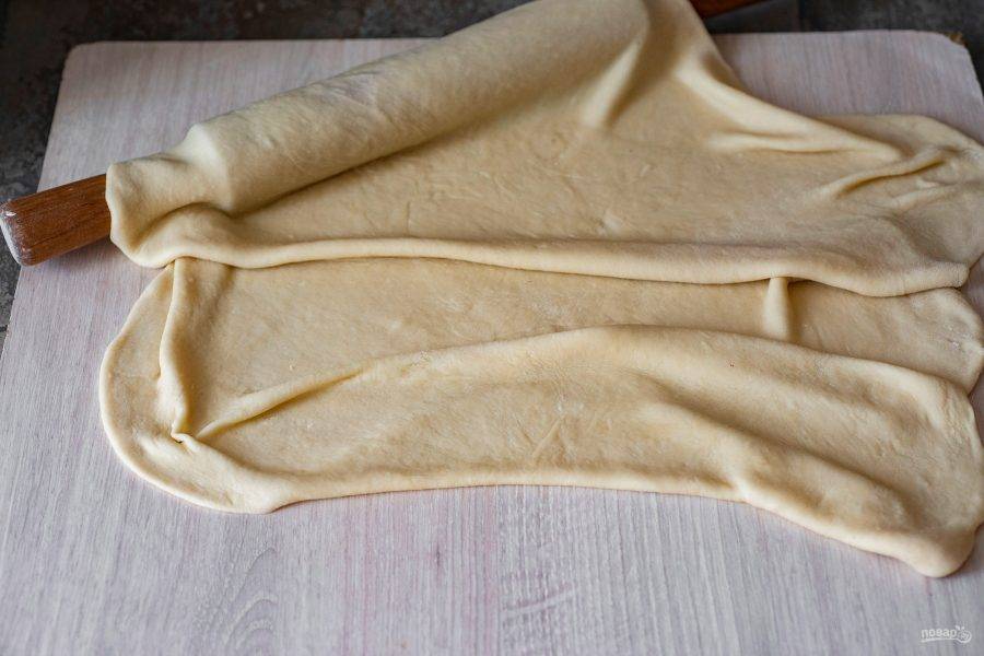 Рабочую поверхность припылите мукой и раскатайте тесто в максимально тонкий пласт.