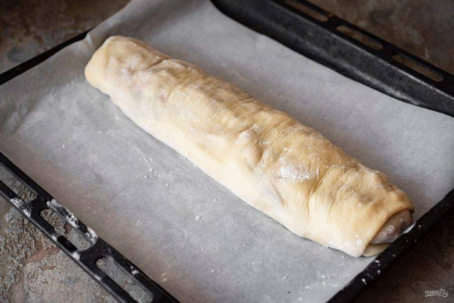 Закрутите тесто рулетом так, чтобы начинка оказалась внутри. Положите заготовку штруделя на противень, застеленный пергаментом для выпечки, поверхность штруделя можно смазать взболтанным яйцом. Отправьте выпекаться в уже разогретую до 180 градусов духовку на 40-45 минут.