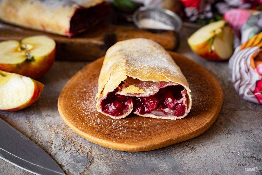 Невероятный десерт — совсем немного тонкого хрустящего теста и очень много сочной вишнево-яблочной начинки. Готовится штрудель совсем не сложно и не долго. Прекрасное угощение к любому чаепитию.