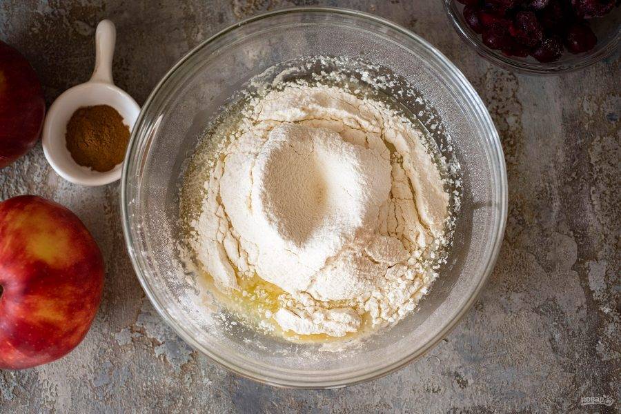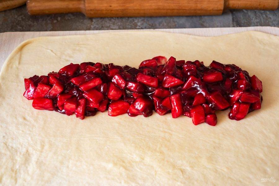 На край теста выложите яблочно-вишневую начинку, как на фото.
