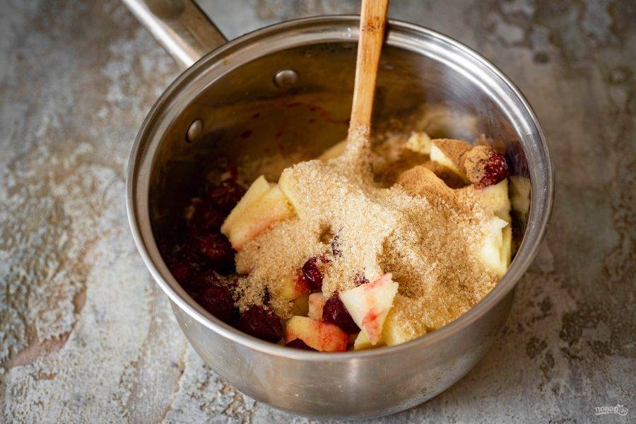Добавьте коричневый сахар и корицу. Поставьте сотейник на небольшой огонь и проварите до закипания выделившейся жидкости, помешивая массу ложкой.