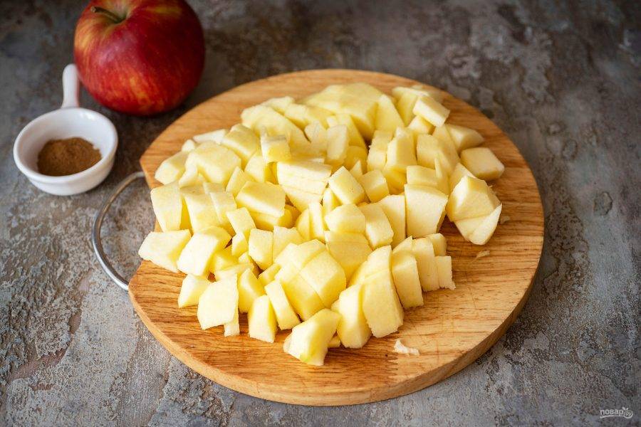 Приготовьте начинку. Яблоки почистите от кожуры и семян, нарежьте небольшими кубиками.