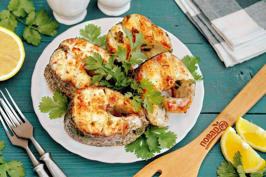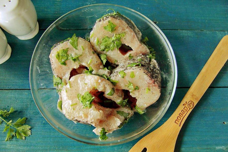Добавьте к стейкам масло, свежевыжатый сок лимона, измельченную зелень, соль и молотый перец по вкусу. Перемешайте и оставьте рыбу мариноваться на 30 минут.