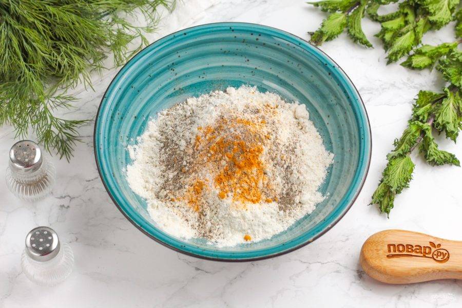 В тарелку или миску высыпьте пшеничную муку высшего сорта, куркуму, соль и молотый черный перец. Перемешайте все между собой.