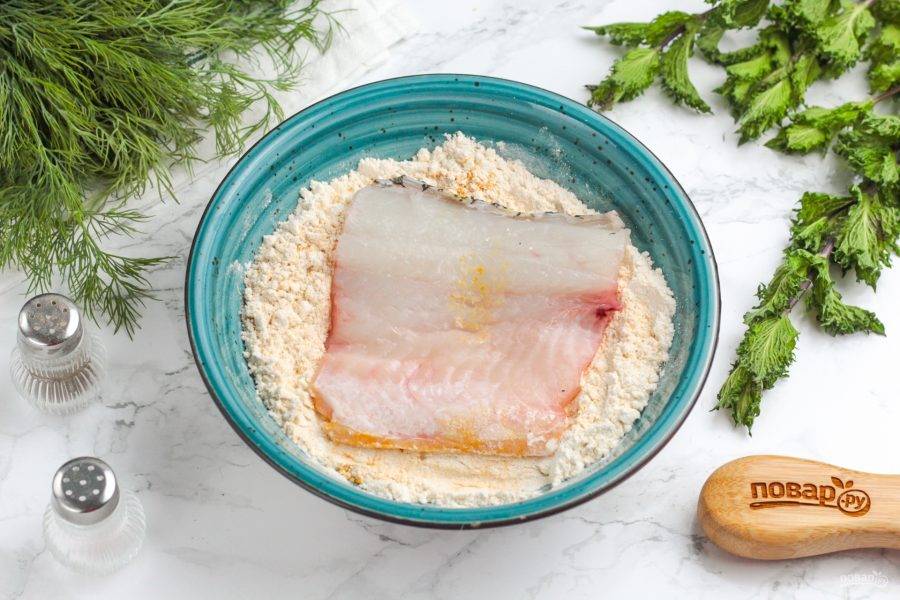 Обпанируйте кусочки рыбы в муке со всех сторон.