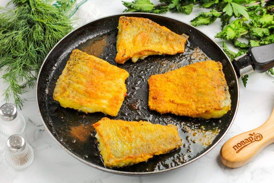 Разогрейте на сковороде растительное масло и выложите в него ломтики щуки. Нагрев убавьте до умеренного и обжарьте их по 4-5 минут с каждой стороны до румяной корочки.