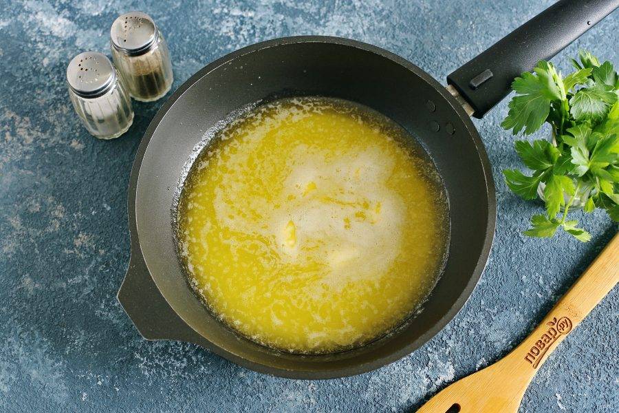 Пока готовится рыба, приготовьте соус. Для этого растопите на другой сковороде кусочек сливочного масла.