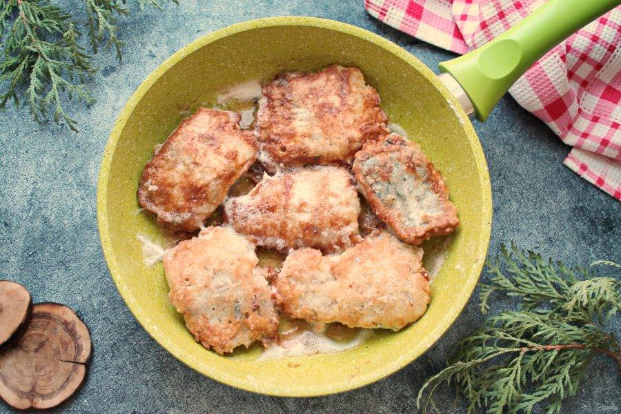 Окуните куски щуки в майонезный кляр. Затем снова в муку и опять в яичную массу.