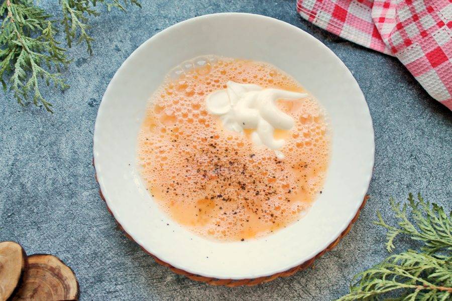 Яйцо разбейте в миску, посолите и перемешайте до однородности. Все посолите и добавьте майонез. Все хорошо перемешайте до однородности.