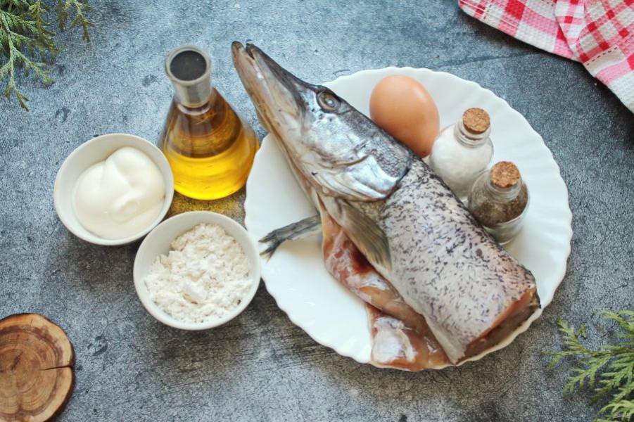 Подготовьте все необходимые ингредиенты для приготовления щуки с майонезом в кляре. Щуку почистите от чешуи, плавников и внутренностей.