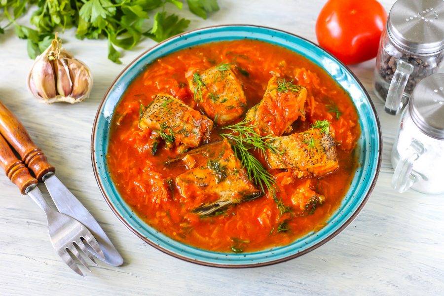 Выложите щуку в томате на тарелки и подайте к столу горячей, можно дополнить блюдо гарниром.