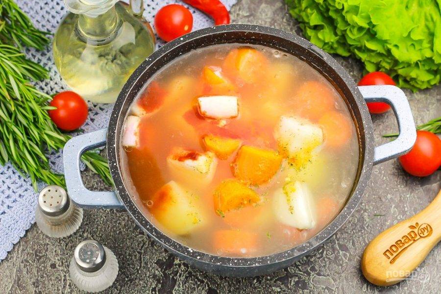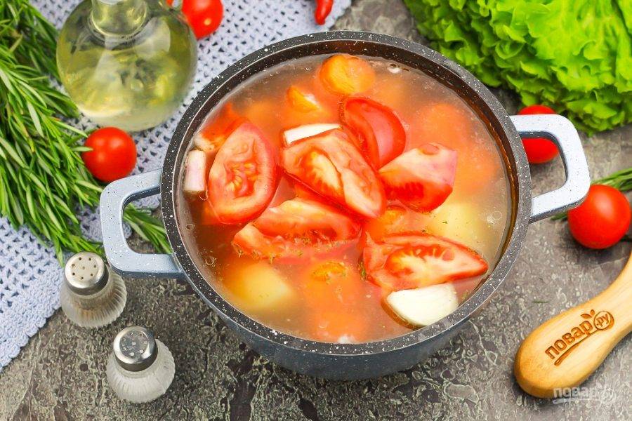 Вырежьте из помидоров зеленые сердцевинки и нарежьте кусочками. Выложите в бульон и доведите все до кипения. Затем нагрев убавьте и отварите шулюм 40 минут.