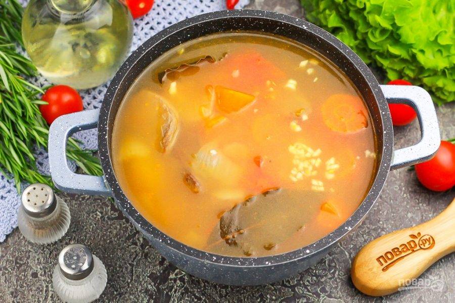 Измельчите очищенные зубчики чеснока и всыпьте их в емкость. По желанию можно добавить и свежую зелень, если ваши родные не против нее в этом аппетитном блюде. Отварите еще 5-10 минут.