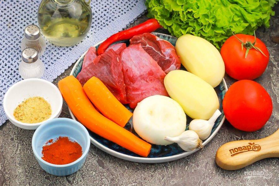 Подготовьте указанные продукты. Очистите картофель, морковь и луковицу, промойте вместе с помидорами.