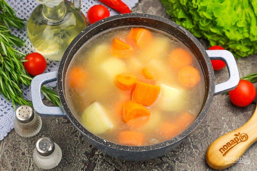 Нарежьте крупно картофель и морковь, добавьте в бульон. По желанию можно дополнить шулюм болгарским перцем или стеблевым сельдереем, они также должны быть крупно нарезаны.