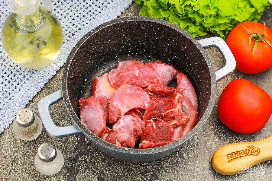 Срежьте с говядины жилы и пленки, нарежьте порционными крупными кусочками. Лучше всего использовать мясо на кости или гуляш. Прогрейте казан или кастрюлю с антипригарным дном на плите, влив в емкость растительное масло. Выложите нарезанное мясо и обжарьте примерно 10-15 минут до румяной корочки.