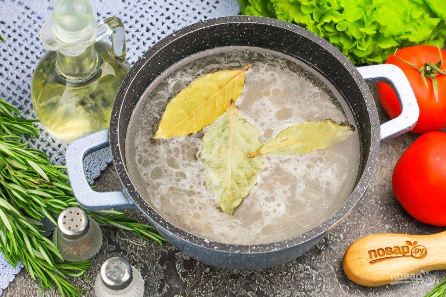 Влейте горячую воду и добавьте лавровые листья. Доведите содержимое емкости до кипения и убавьте нагрев до умеренного. Отварите мясо в течение 40 минут, слегка прикрыв емкость крышкой.