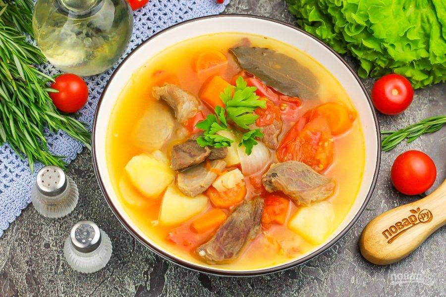 Разлейте горячий шулюм из говядины в глубокие тарелки или пиалы и подайте к столу. Он замечательно сочетается со сметаной, греческим йогуртом, чесночным майонезом. Приятного вам аппетита!