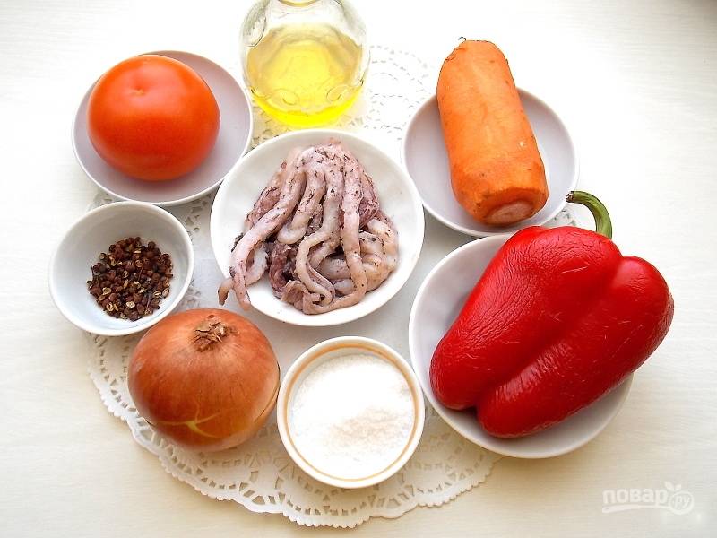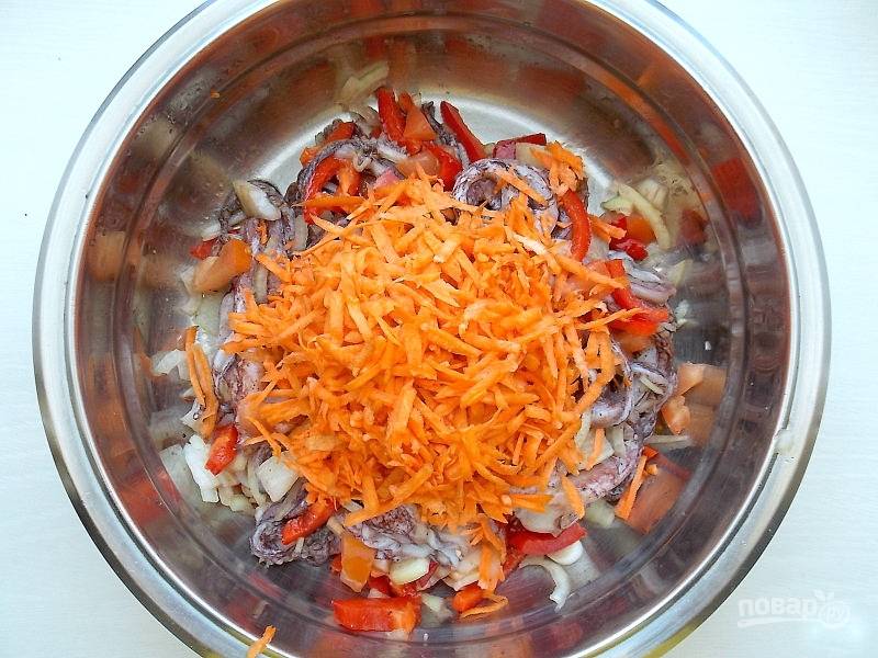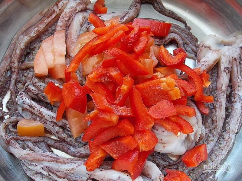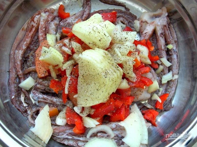 Лук порежьте, добавьте к щупальцам и овощам, положите сахар, соль, поперчите и добавьте масло. Все перемешайте.