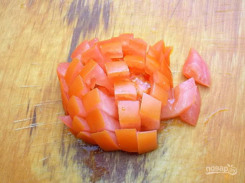 Затем уберите пленку, которая отойдет, остальное оставьте. Порежьте помидор на кусочки. Добавьте к щупальцам.