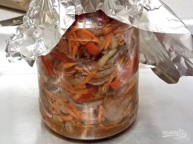 Уложите продукты в чистую банку, закройте сверху фольгой и поставьте в холодную духовку. Поставьте t=220 и забудьте про банку на 2 часа.