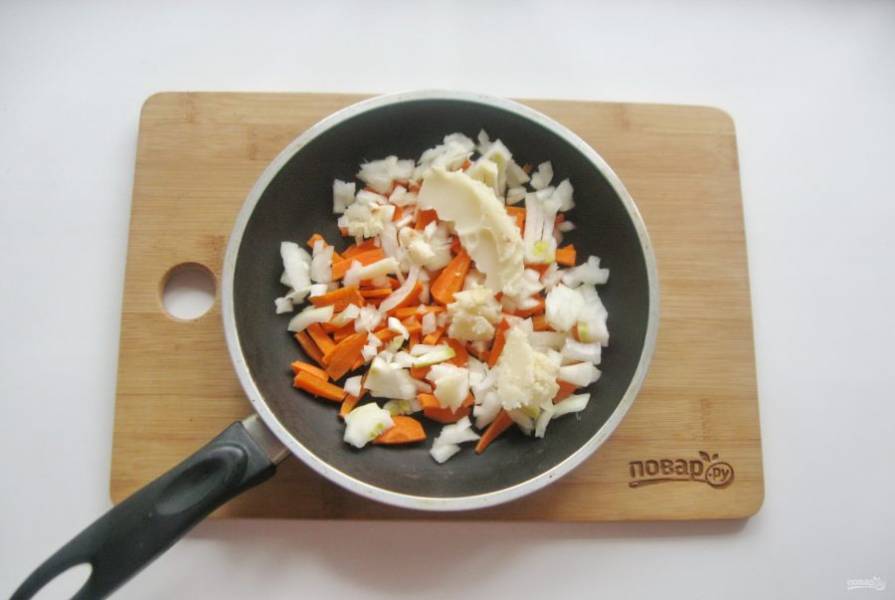 Морковь и лук очистите, помойте и нарежьте. Выложите в сковороду. Добавьте жир из тушенки. Слегка припустите овощи в сковороде с жиром.
