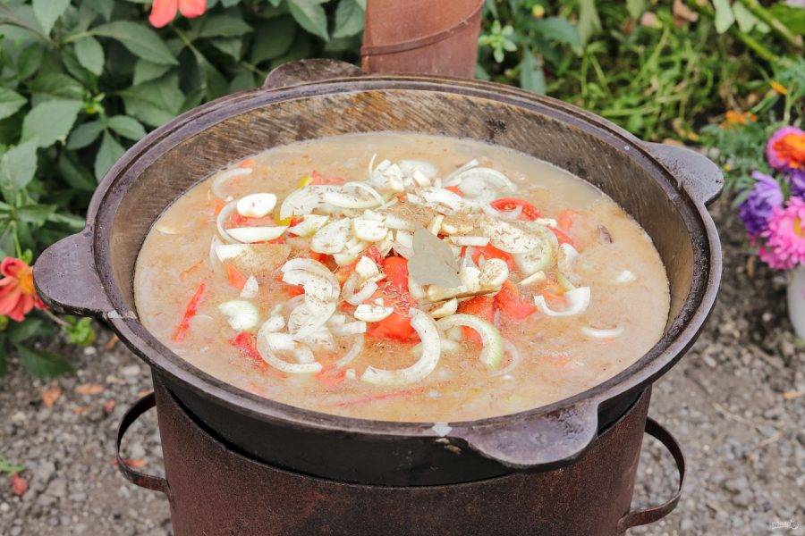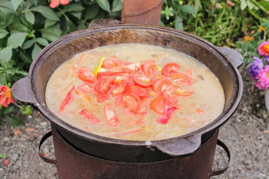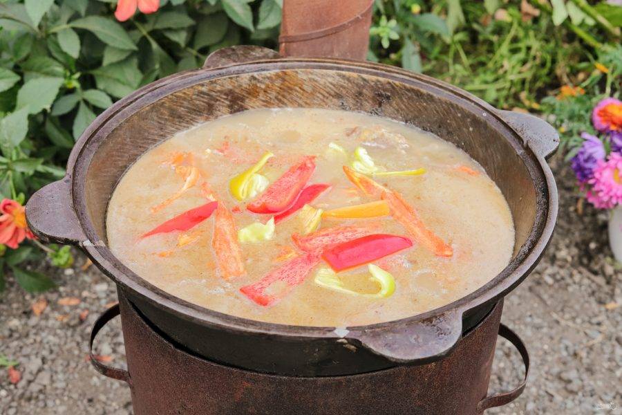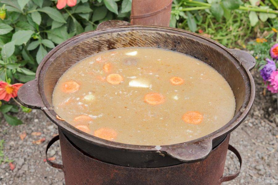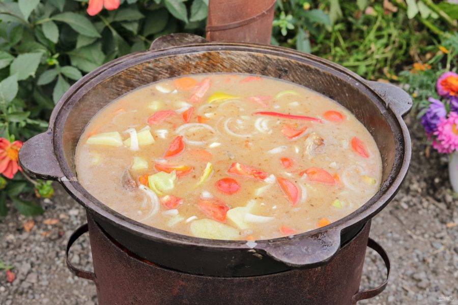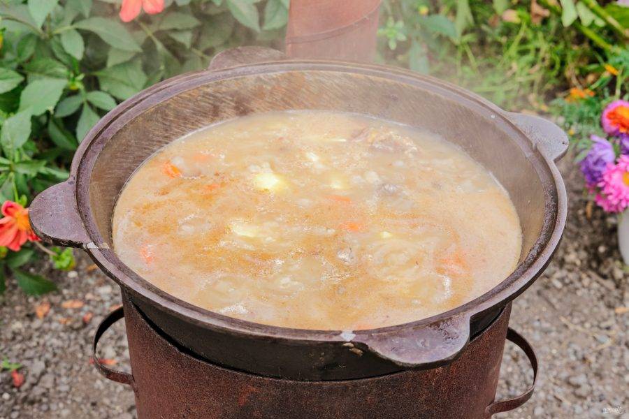 Перемешайте и поддерживая слабое кипение готовьте всё вместе ещё около 15 минут, регулируя количество поленьев, а точнее уже углей, т.к. на этой стадии уже не нужен прямой огонь, достаточно будет тлеющих головешек.